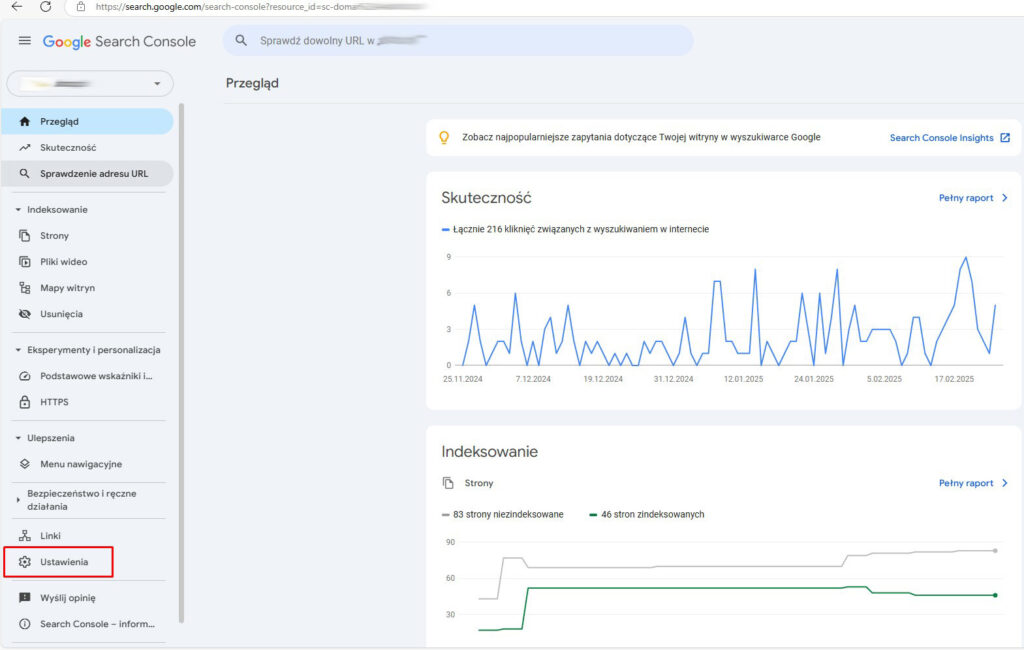 Będąc zalogowanym do usługi Google Search Console przechodzimy do ustawień wybierając pole z ikoną koła zębatego „Ustawienia”